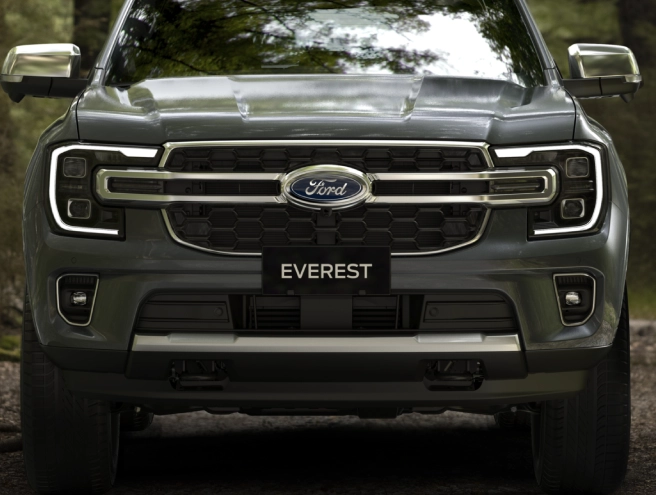 Phần đầu xe Everest Titanium đặc biệt nổi bật với lưới tản nhiệt dạng lưới mạ crôm kết hợp cùng cụm đèn LED hình chữ C mang đậm đặc trưng thiết kế toàn cầu của Ford. Các điểm nhấn mạ crôm trên gương, tay nắm cửa, bậc lên xuống hai bên xe tạo nên vẻ cứng cáp nhưng vẫn vô cùng sang trọng cho chiếc xe