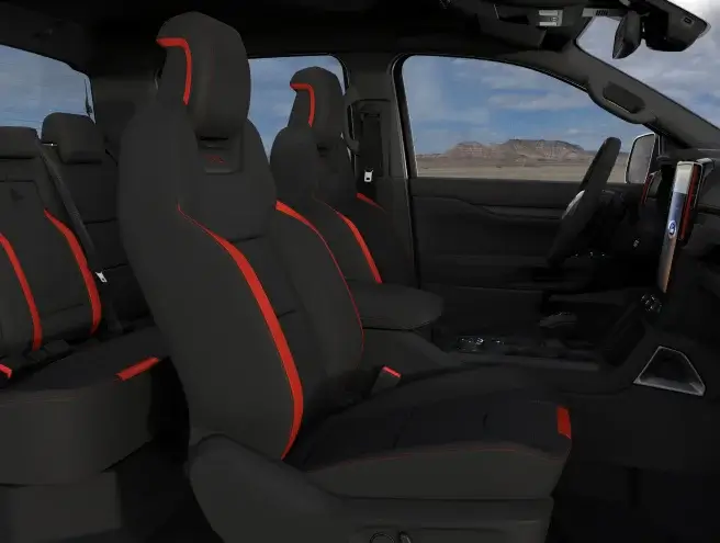 Ghế thể thao với logo Raptor dập nổi và đường chỉ khâu tông màu cam nổi bật. Lấy cảm hứng từ máy bay chiến đấu phản lực, ghế ngồi xe Raptor có thiết kế ôm trọn người lái, giúp lái xe có tư thế chắc chắn khi ôm cua hoặc tiếp đất. Các đường chỉ khâu độc đáo và kết hợp với da lộn giúp tối ưu sự thoải mái và tăng tính thẩm mỹ.